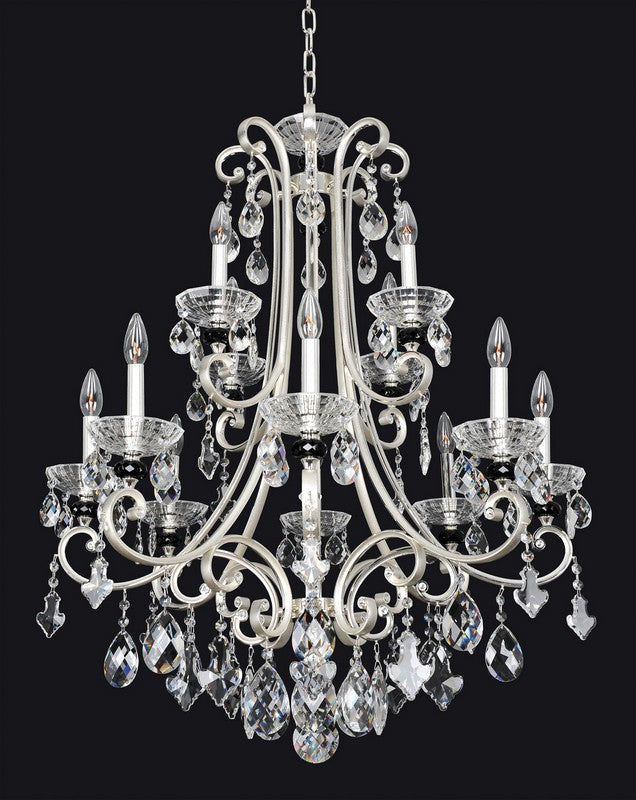 2.18 Light Chandelier. The Campra Collection features a Clear Firenze teardrop stem, Silver curves, Clear and Smoke Fleet Argentine bobeches, and Swarovski or Firenze crystals.