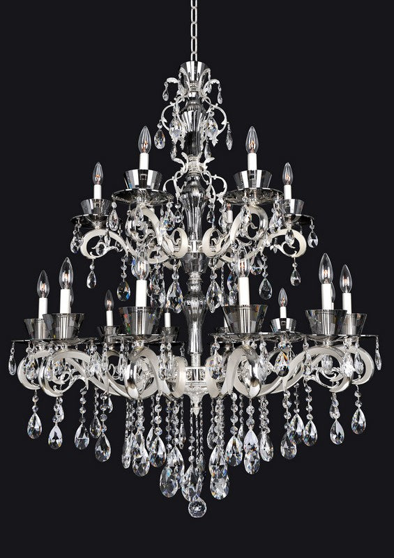2.4 Light Chandelier. The Legrenzi Collection fuses modern design with traditional elegance, featuring ornate stems, curves in Antique Silver Leaf or Two-tone 24k Gold, Clear Firenze bobeches, and draped crystals for glamorous sparkle.