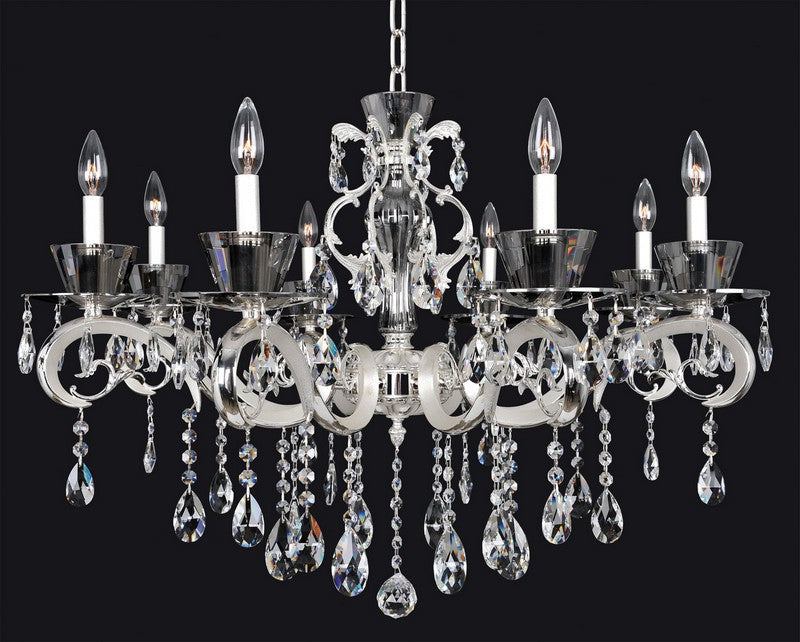3.6 Light Chandelier. The Legrenzi Collection fuses modern design with traditional elegance, featuring ornate stems, curves in Antique Silver Leaf or Two-tone 24k Gold, Clear Firenze bobeches, and draped crystals for glamorous sparkle.
