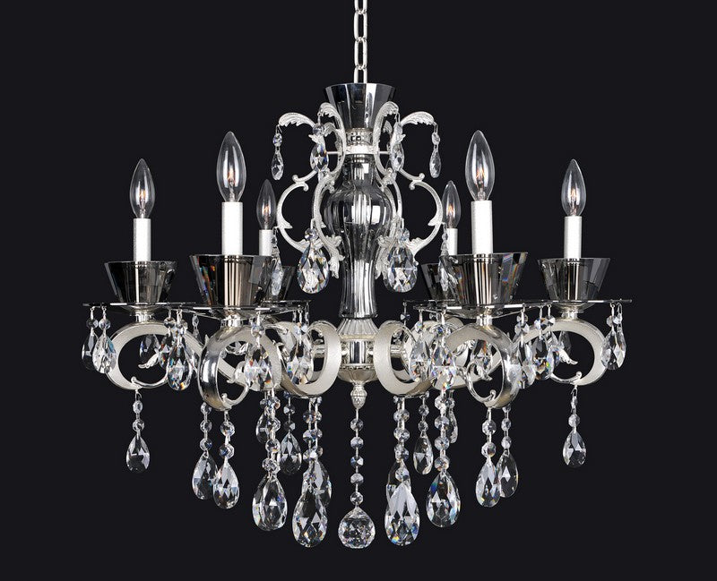 4.4 Light Chandelier. The Legrenzi Collection fuses modern design with traditional elegance, featuring ornate stems, curves in Antique Silver Leaf or Two-tone 24k Gold, Clear Firenze bobeches, and draped crystals for glamorous sparkle.