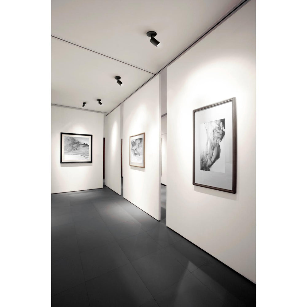 Cylindrical lamp head with recessed bulb socket. Circular attachment plate with vertical stem. Powder-coat finish. Adjustable directional light (90 Degrees).