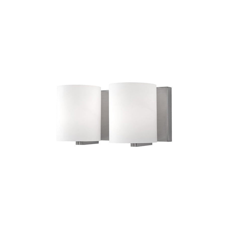 Two lamp vanity with white opal cylinder glass with your choice of brushed nickel or chrome metal details.