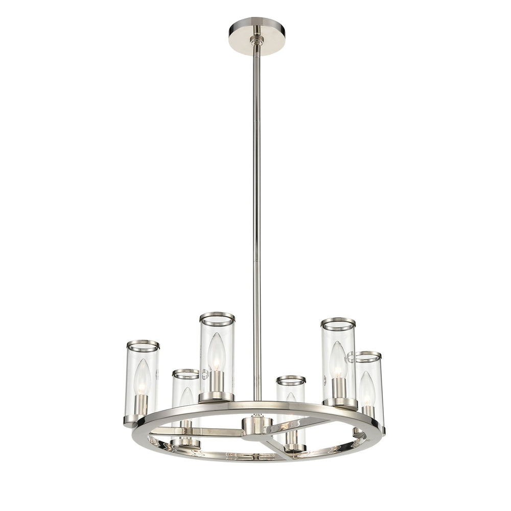 Evoking the elegance of antique candle-holders, Revolve has clear glass tubes accented with metal rings, gathered around a striking chandelier body. Available in our Polished Nickel, Urban Bronze and Natural Brass finishes, also available as a series of coordinating vanity and wall sconces.