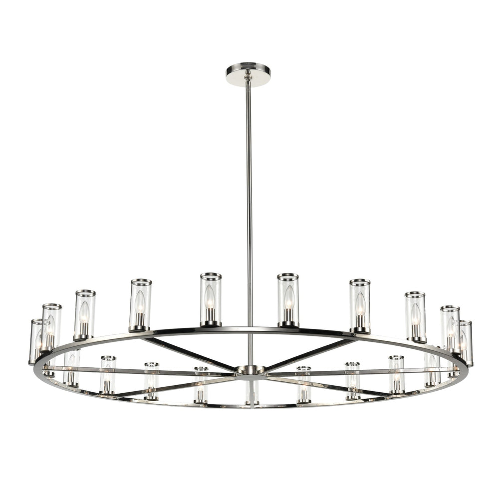 Evoking the elegance of antique candle-holders, Revolve has clear glass tubes accented with metal rings, gathered around a striking chandelier body. Available in our Polished Nickel, Urban Bronze and Natural Brass finishes, also available as a series of coordinating vanity and wall sconces.