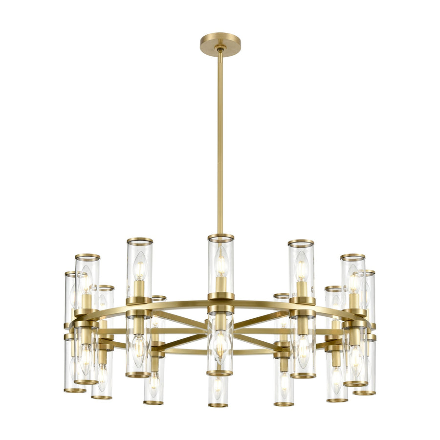 Evoking the elegance of antique candle-holders, Revolve has clear glass tubes accented with metal rings, gathered around a striking chandelier body. Available in our Urban Bronze and Natural Brass finishes, it also comes as a series of coordinating wall sconces.