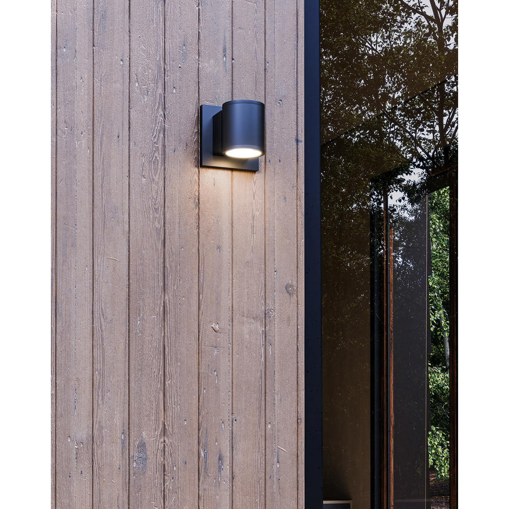 Architectural exterior wall sconce, die-cast aluminum cylindrical body with clear tempered glass and multi-faceted reflector to provide even illumination in both direction. Rated IP65.