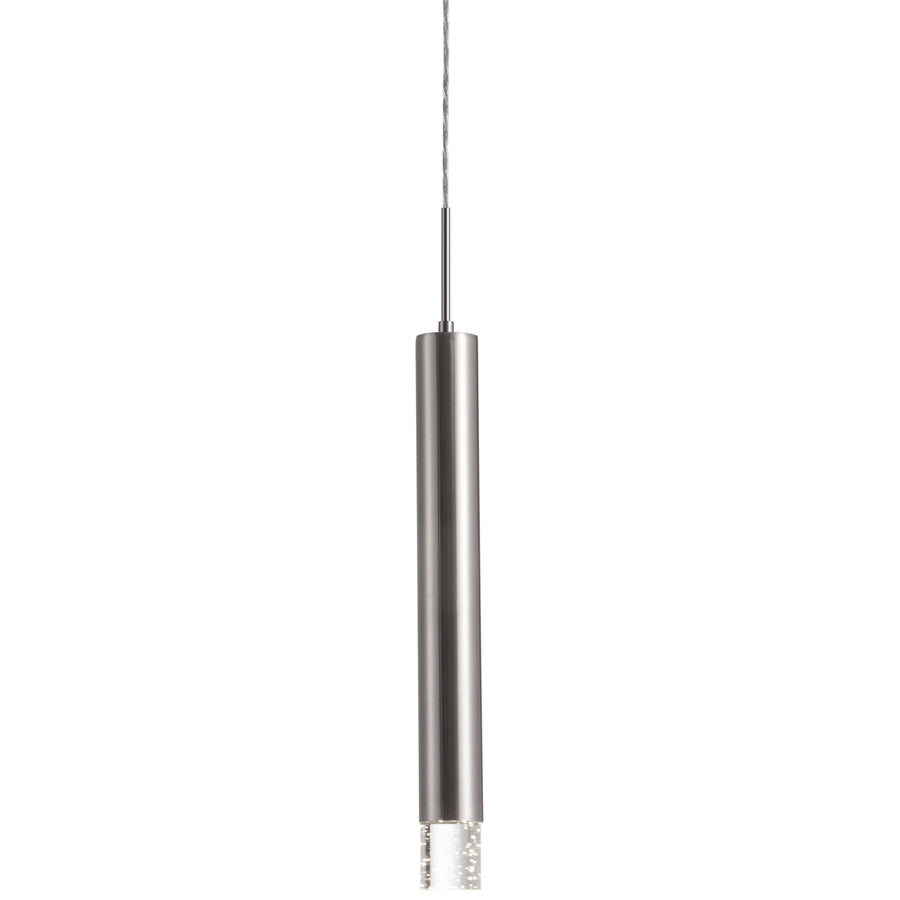 Round nine LED multi-pendant with two different styled pendants in a mixed arrangement. Four pendants have a short sleek metal housing with a long bubble encased crystal and five of the pendants have a long sleek metal housing and short bubble encased crystals which can be arranged in many different styled arrangements. When lit the crystals illuminate the light beautifully throughout the fixture and intensifies the room it resides in. Chrome metal details and Kuzco SSL wire, provided with our powerful 12V AC LED technology. Available in single pendants and other multi-pendant arrangements.